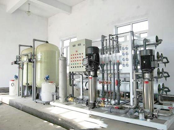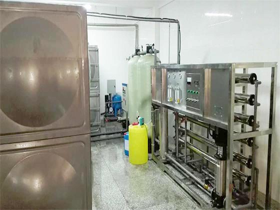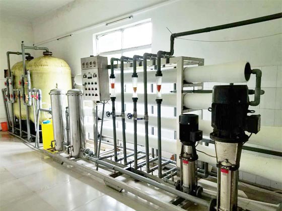 原水 → 原水箱 → 原水泵 →多介質(zhì)過濾器 (石英砂過濾器)→活性炭過濾器 →軟水處理器(添加阻垢劑裝置) → 精密過濾器 → 高壓泵 → 一級反滲透(RO)裝置 →紫外線殺菌裝置(臭氧殺菌裝置) → 用水點